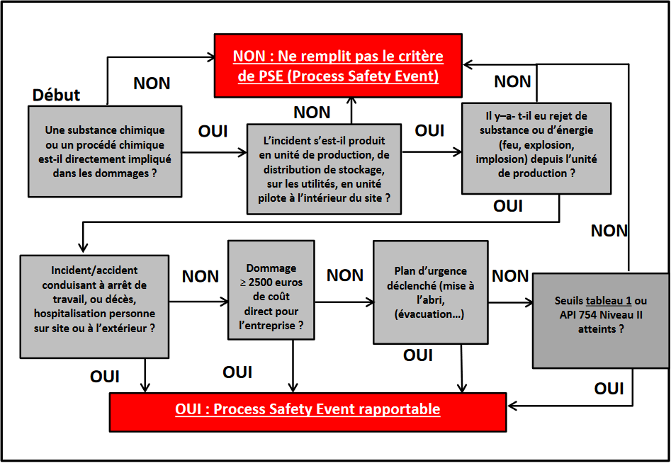 - nombre d’incidents de sécurité des procédés (= évènements de perte de confinement : rejet matière ou énergie, explosion, implosion, incendie, autre, voir le logigramme de définition d’un PSE ci-dessous).